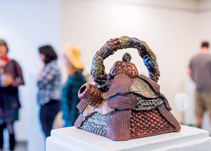 “There are certain basic elements to teapots that set them apart from more common forms, like bowls or cups. Keith wants to push us to incorporate these components using as much creativity as possible,” says Art major Priscilla La Salle. Her rabbit teapot, “Lucky,” and more than 30 other teapots were on display at the annual student teapot show on campus last semester.