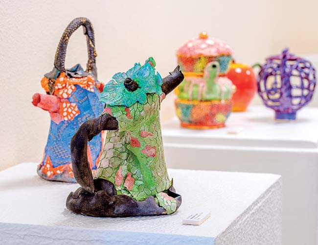 Some teapots are fanciful. The ceramic and plaster “Female Roman Statue” by HSU alumnus and notable ceramicist Michael Lucero (’75, Art) is a teapot head atop a tunic-draped body. His piece and one created by Schneider happen to be among the 17,000 teapots amassed over 35 years by Los Angeles collectors Sonny and Gloria Kamm.